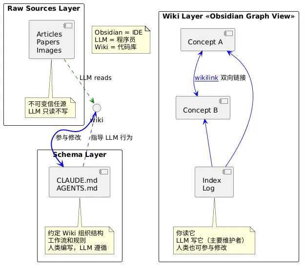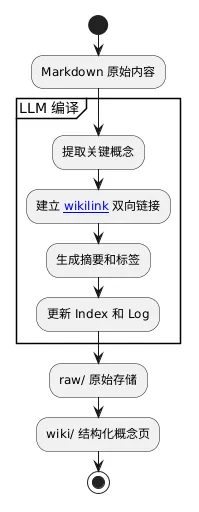 读取 raw/ 中的 Markdown LLM 提取关键概念 生成结构化 wiki 页面 建立双向链接 更新索引和日志