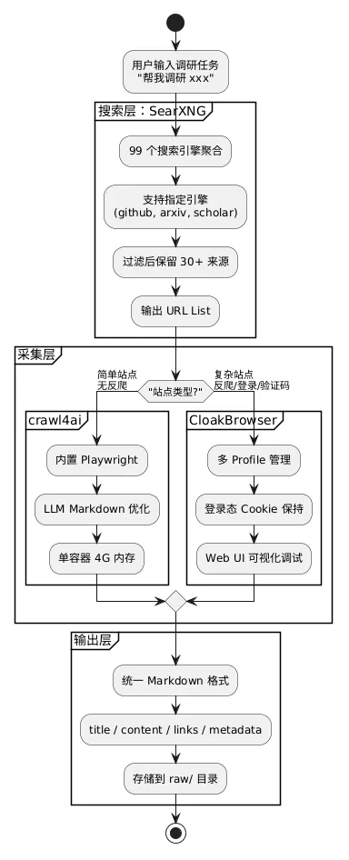 ✅ 采集链路打通(SearXNG + crawl4ai + CloakBrowser) ✅ Git 同步流打通(PC ↔ Gitea ↔ NAS) ✅ OpenClaw 定时任务配置(每天 3:00 / 12:00 自动调研) 🔄 持续采集中