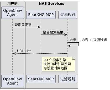 不依赖单一搜索 API:分布式搜索,避免被封 支持指定引擎:可以只搜学术资料或只搜 GitHub 开源可控:部署在自己 NAS上 MCP 协议支持:可以接入 OpenClaw 作为工具