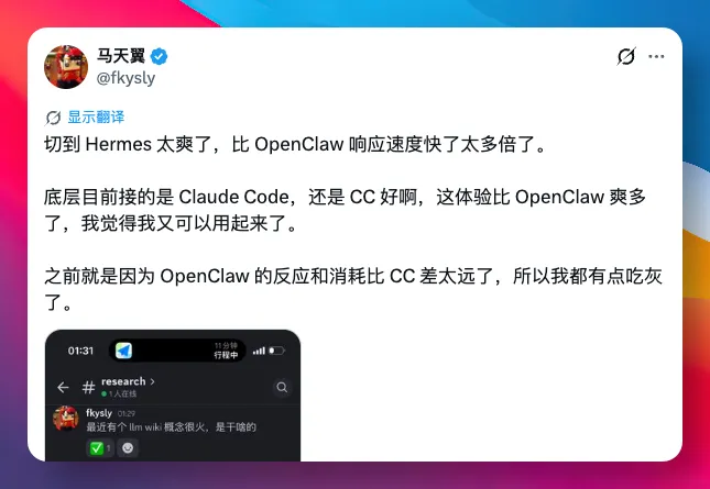 有网友迁移到 Hermes Agent 后说:「切到 Hermes 太爽了,比 OpenClaw 响应速度快太多倍」。