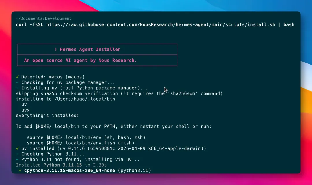 curl-fsSL https://raw.githubusercontent.com/NousResearch/hermes-agent/main/scripts/install.sh | bash