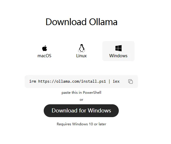 直接上Ollama官网(https://www.ollama.com/download/windows)下载Ollama安装程序,Ollama需要Windows 10以上操作系统。