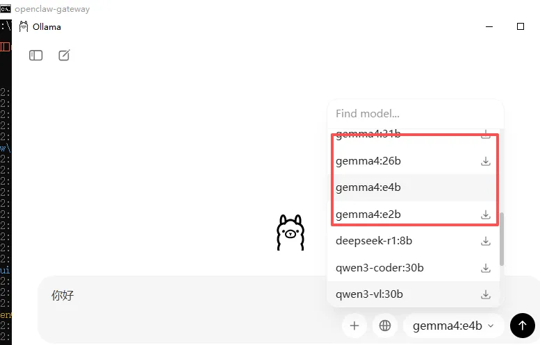这时候选择右下角的大模型选择框,拉到下面,选择本地大模型(没有cloud结尾的),就不需要登录了。我这里选择gemma4:e2b,选择好之后,随便发几个字,如果该大模型本地还没有安装,Ollama会自动下载安装该大模型。