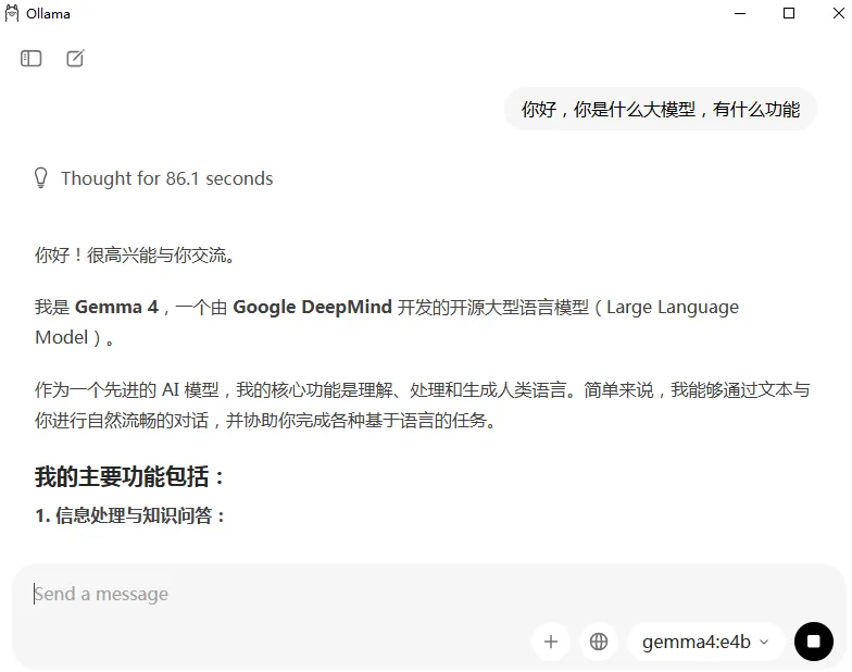 下载完成之后,在Ollama对话框,就可以和gemma 4聊天了。我电脑配置有点低,速度还是有点慢。