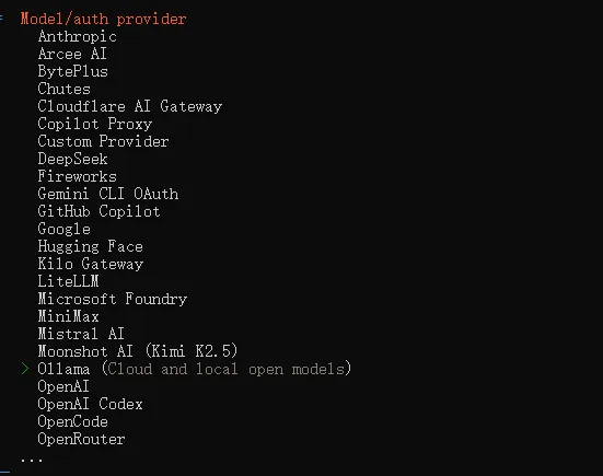 openclaw config选择models配置,然后选择Ollama。