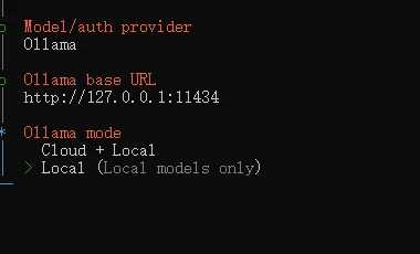 然后一直默认回车,Ollama mode 选择Local(本地大模型)