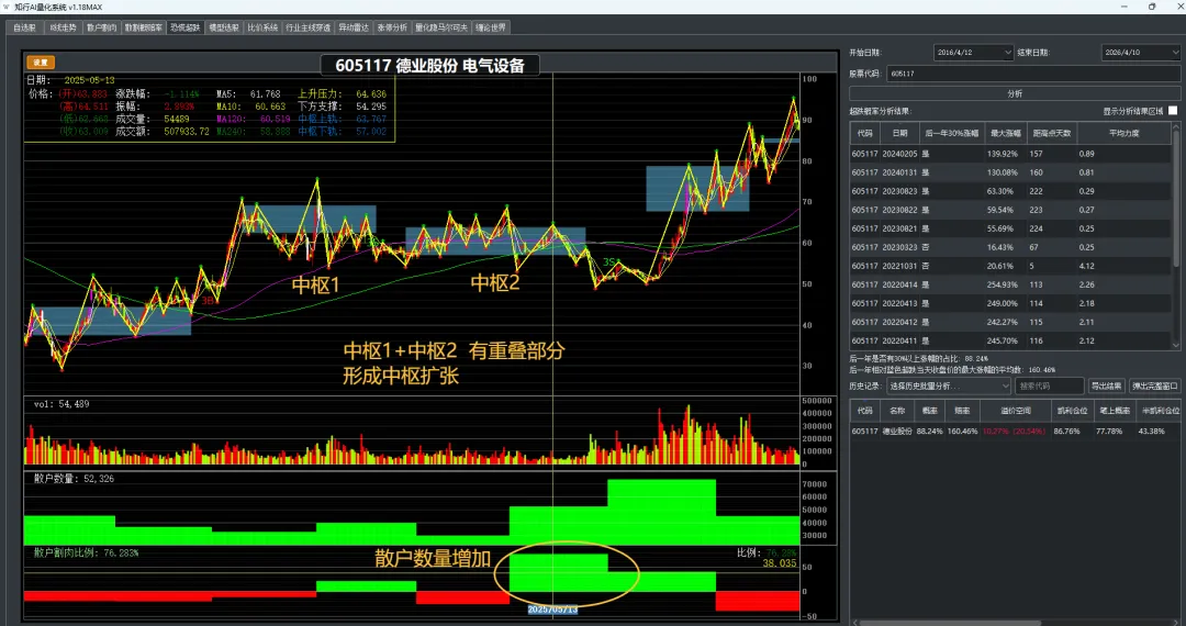 在缠论体系里,上涨+盘整+上涨 = 趋势延续;上涨+盘整+下跌 = 反趋势。德业股份属于前者。知行AI自动识别中枢结构,不需要你手动画线。