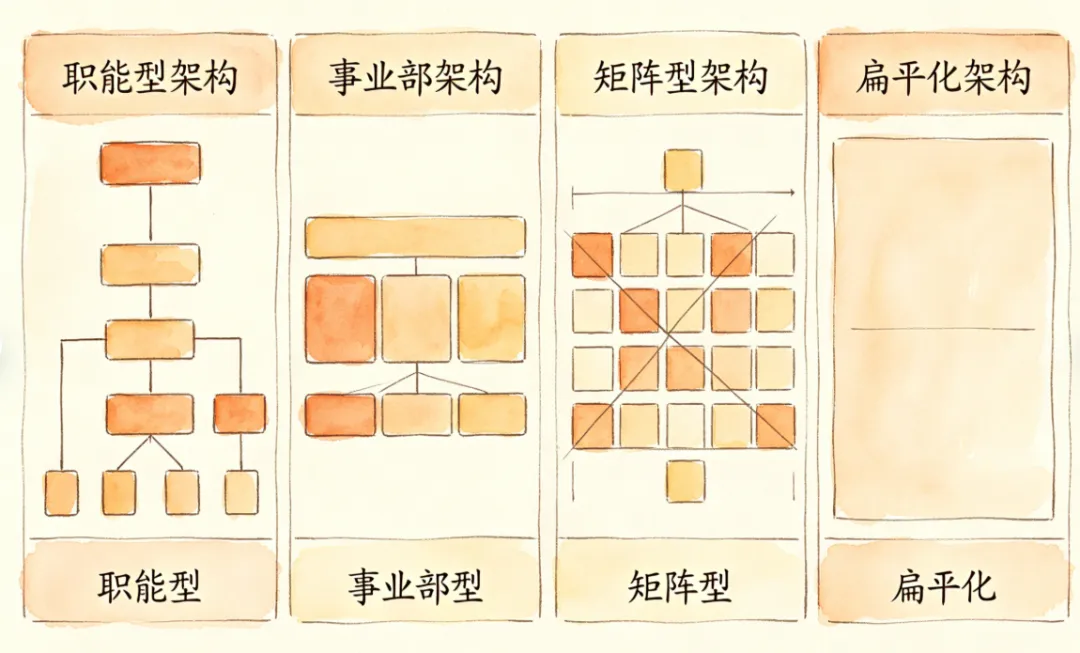• 职能型:按专业分工,适合稳定业务