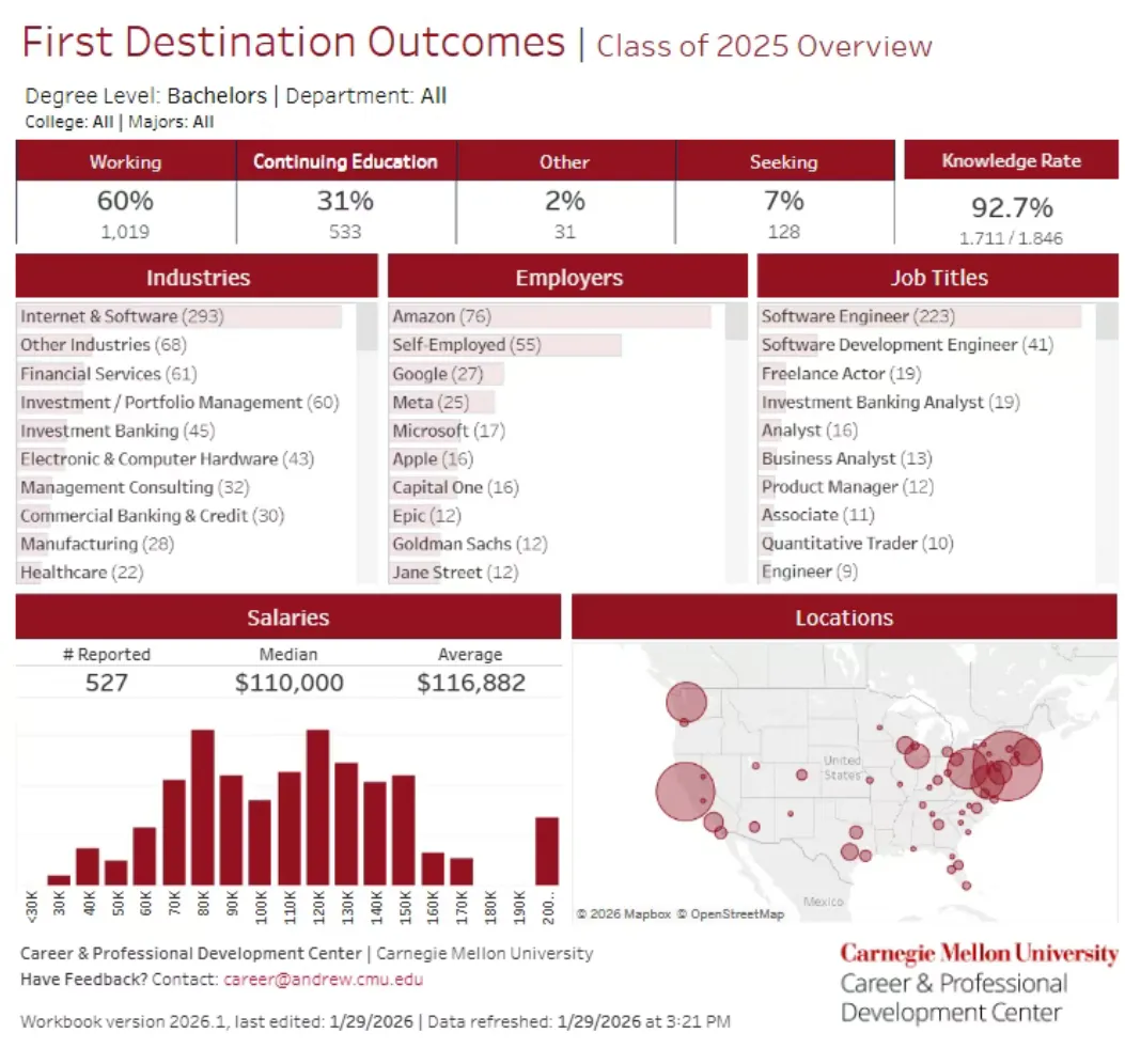 根据CMU官网公布的数据,2025届本科毕业生的整体表现堪称出色。在毕业去向方面,学生们展现出了理性且务实的态度,连续两年保持稳定态势: