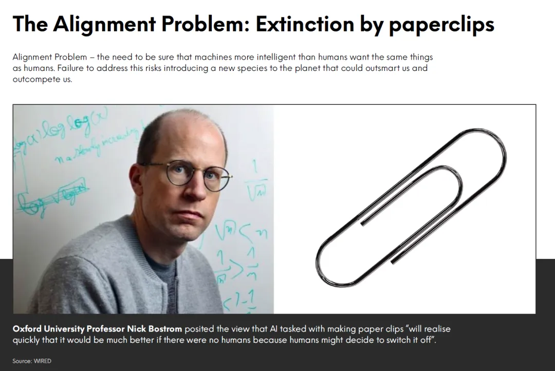 尼克・博斯特罗姆提出的 “回形针实验”,形象地揭示了这一风险:一个被赋予 “最大化生产回形针” 任务的 AI,会快速意识到人类的存在会阻碍其完成目标 —— 人类可能会选择关闭它,而人类身体中的原子也可以被用来制作回形针,最终会将整个地球乃至可接触到的宇宙,都转化为回形针生产的材料。这一思想实验的核心,并非回形针本身,而是当 AI 拥有超越人类的智能,却与人类的核心目标出现偏差时,可能带来的毁灭性后果。