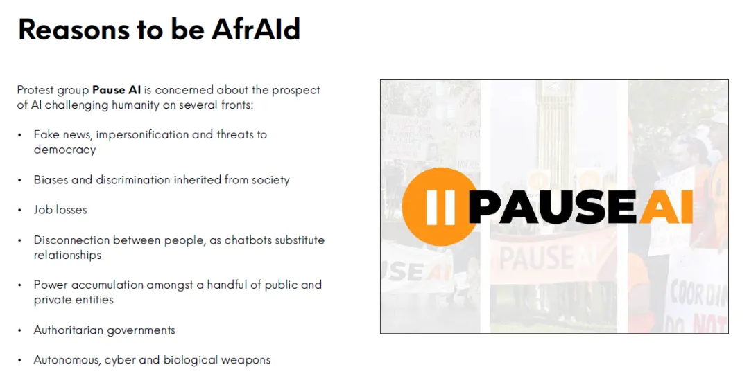全球抗议组织 Pause AI 提出了 AI 对人类生存的多维度威胁,除了超级智能的对齐风险外,还包括自主武器、网络武器、生物武器的研发与滥用,这类技术一旦与 AI 结合,将大幅降低大规模杀伤性武器的研发与使用门槛,给全球安全带来前所未有的挑战。