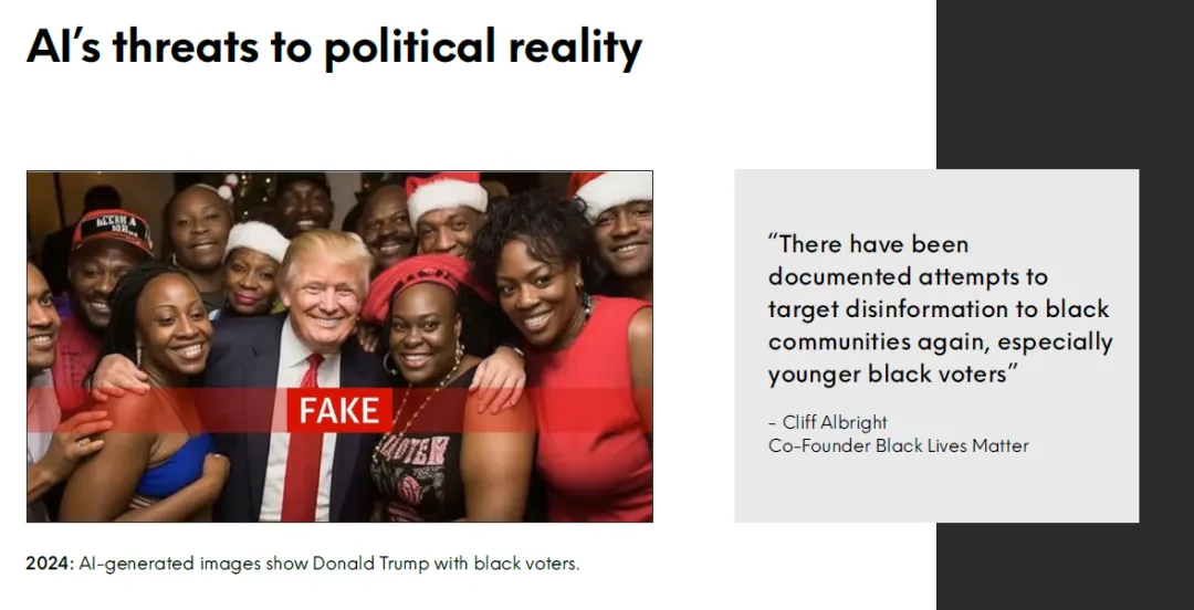 2024 年美国大选期间,出现了大量 AI 生成的特朗普与黑人选民同框的虚假图片,相关内容被定向传播至黑人群体,尤其是年轻黑人选民,试图通过虚假信息影响选民的投票意向。Black Lives Matter 联合创始人克里夫・奥尔布赖特明确表示,已有明确记录显示,有势力通过 AI 生成的虚假信息,针对黑人群体定向传播不实内容,干扰选举进程。