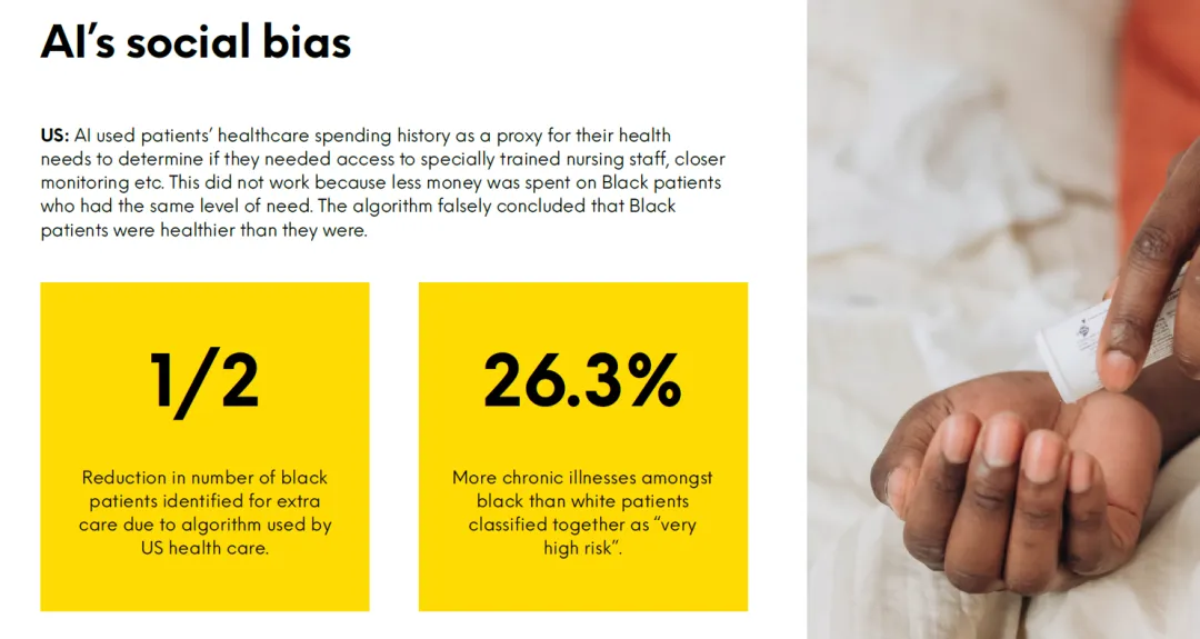 美国医疗体系中曾出现典型的 AI 偏见案例:医疗机构使用 AI 算法,以患者的医疗支出历史作为健康需求的代理指标,判断患者是否需要专业护理人员、密切健康监测等服务。但这一算法存在根本性的缺陷 —— 对于同等健康需求的黑人患者,美国医疗体系的资金投入远低于白人患者,算法基于这一数据,错误地判定黑人患者的健康状况优于实际水平,最终导致被识别为需要额外护理的黑人患者数量大幅减少。数据显示,被统一归类为 “极高风险” 的患者中,黑人患者的慢性病患病率比白人患者高出 26.3%,却被算法判定为更健康,无法获得应有的医疗资源。