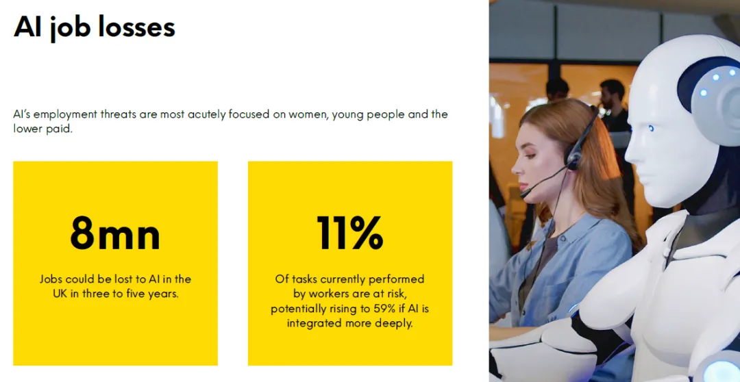 从冲击规模来看,英国公共政策研究所(IPPR)的数据显示,未来 3 到 5 年,英国可能有 800 万个岗位被 AI 替代,当前劳动者执行的任务中,有 11% 面临被 AI 替代的风险,若 AI 技术实现更深层次的产业融合,这一比例将上升至 59%。从受影响人群来看,AI 带来的就业冲击,对女性、年轻人、低收入群体的影响最为显著,这类群体更多从事重复性、标准化的脑力工作,也是 AI 替代的核心目标。