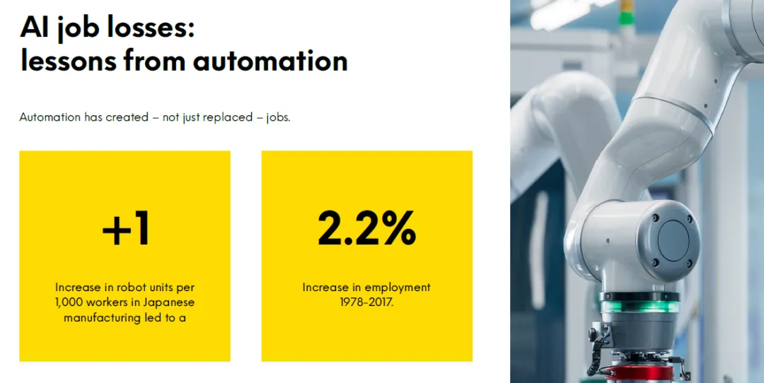 与此同时,AI 也创造了全新的就业岗位。机器学习模型的训练,需要海量的人工数据标注工作,Sam's、Appen、Clickworker 等企业,雇佣了大量全球南方国家的劳动力,让从业者居家即可完成数据集标注工作,这类幕后工作已经成为 AI 产业发展的底层基础,也为全球劳动力市场创造了新的就业机会。世界经济论坛的数据也显示,1978 年至 2017 年,日本制造业每千名工人对应的机器人数量增加 1 个,就会带来 2.2% 的就业增长,证明技术革命在替代岗位的同时,也会创造新的就业需求,核心在于劳动者能否完成能力的转型与适配。