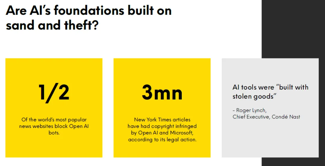OpenAI 已明确披露,ChatGPT 的训练使用了 “Common Crawl” 数据集,该数据集抓取了互联网上大量受版权保护的内容,这一行为已经引发了全球媒体企业、内容创作者的法律诉讼。《纽约时报》在诉讼中明确表示,OpenAI 与微软未经授权使用了其 300 万篇文章,侵犯了自身的知识产权;全球有一半的主流新闻网站,已经屏蔽了 OpenAI 的爬虫程序,拒绝其抓取自身的原创内容。康泰纳仕首席执行官罗杰・林奇直言,当前的 AI 工具 “是用赃物搭建起来的”。