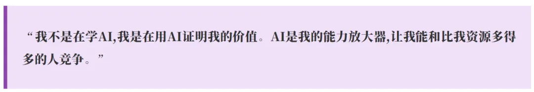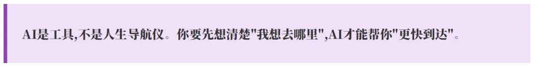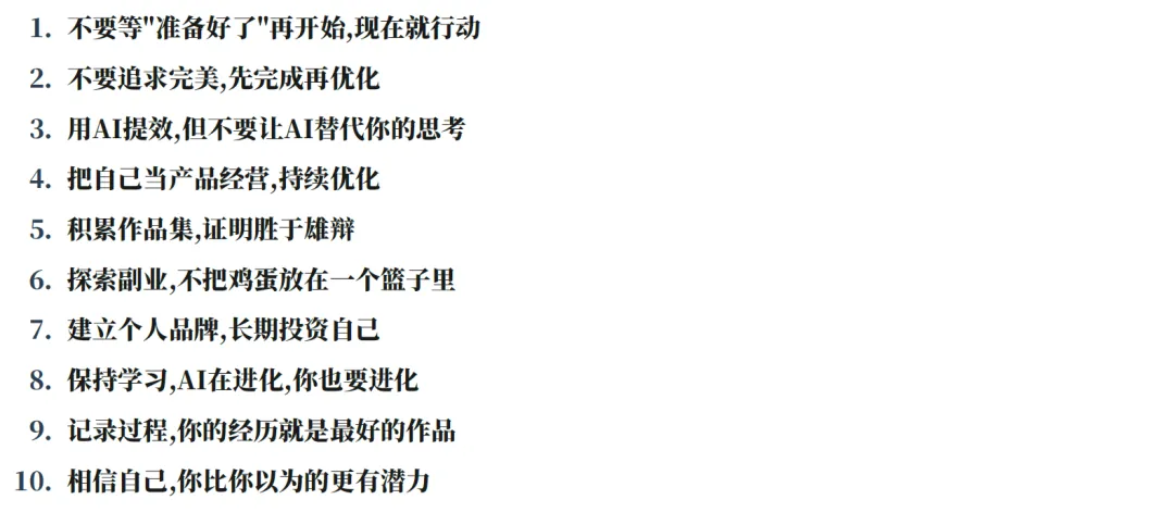 第三,持续的自我驱动与目标感,是 AI 无法赋予的。AI 能够帮助用户制定详细的学习计划、工作任务清单,能够生成激励性的文案,提醒用户完成每日任务,但无法替用户想清楚 “人生的目标是什么”,无法在用户想要放弃的时候提供内在的坚持动力,更无法赋予用户人生的意义感与价值感。所有的工具与方法,都需要建立在用户清晰的目标与持续的行动之上,这是 AI 永远无法替代的,也是个人职业发展的底层核心。