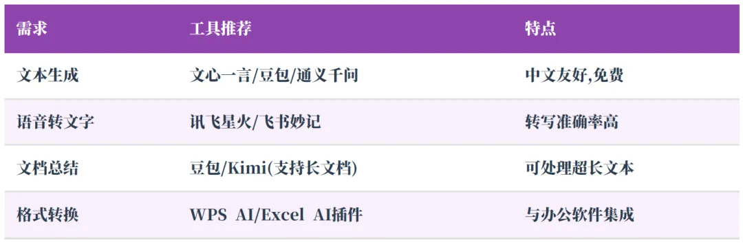 第一,信息处理与生成能力,可替代 60% 的基础工作。AI 能够高效完成文本生成、格式转换、数据清洗、内容总结等工作,覆盖会议纪要、周报月报、邮件撰写、文档整理、数据处理等职场高频场景,将职场人从海量的重复性基础工作中解放出来,是职场中最基础、应用最广泛的 AI 能力。