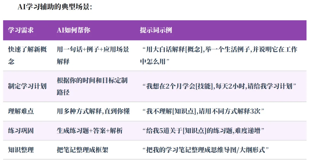 在学习成长加速场景,AI 能够成为个人的专属私教,实现比同龄人快 5-10 倍的技能提升,核心包括 6 个实战方向:一是快速学习新技能,用 AI 制定个性化的学习路径,拆解学习目标,实现零基础快速入门;二是读书笔记整理,用 AI 提炼书籍的核心观点、金句、框架,将厚书读薄,同时完成知识的体系化整理;三是知识体系搭建,用 AI 将碎片化的学习内容,整理成结构化的知识体系,实现知识的内化与沉淀;四是代码学习,用 AI 实现代码讲解、bug 调试、项目实战指导,零基础也能快速入门编程;五是英语学习,用 AI 完成单词记忆、语法讲解、口语对话、翻译练习,实现沉浸式的英语学习;六是考证备考,用 AI 生成考点梳理、练习题、模拟试卷、记忆口诀,大幅提升备考效率。