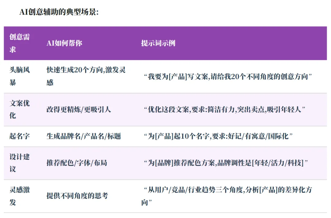 第三,创意辅助与灵感激发能力,可将创作效率提升 3-5 倍。AI 能够完成头脑风暴、文案优化、设计建议、创意方向生成等工作,覆盖营销方案、文案创作、PPT 设计、品牌策划等创意类场景,能够快速生成大量的创意方向,帮助职场人打破思维局限,同时完成创意内容的初稿创作与优化,大幅提升创意工作的效率。