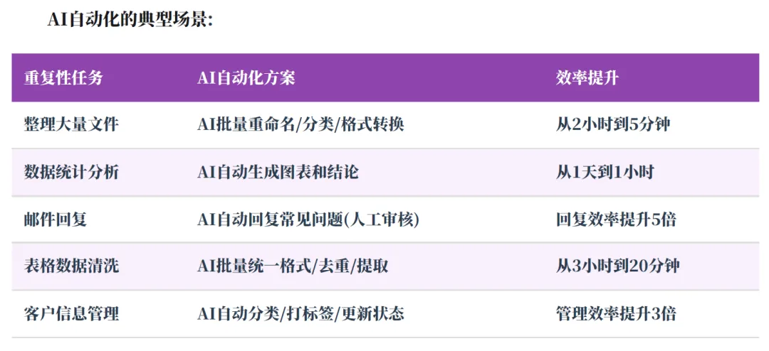 第四,流程自动化与效率优化能力,可减少 70% 的重复性工作。AI 能够实现批量文件处理、自动化数据统计分析、常见问题自动回复、工作流程优化等功能,针对高频、重复、标准化的工作流程,能够实现全流程的自动化处理,不仅大幅提升工作效率,还能够减少人工操作带来的失误,同时让职场人能够从重复性工作中抽离,聚焦更有价值的流程优化与创新工作。