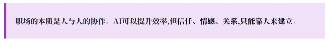 第一,真实的人际关系与信任建立,是 AI 永远无法替代的。AI 能够辅助撰写邮件、感谢信、道歉信,能够生成团建方案与沟通话术,但无法替代人与人之间真诚的沟通、情感的传递、信任的建立与个人影响力的打造。职场的本质是人与人的协作,高效的团队协作、客户关系维护、跨部门沟通,核心都依赖于真实的人际互动,这是 AI 无论如何都无法替代的。