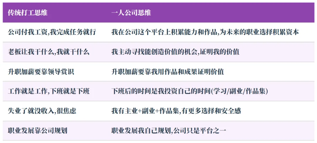 “一人公司” 并非指必须辞职注册公司、全职创业,而是一种经营自己的思维方式 —— 把自己当作一个独立的价值创造单元,像经营一家公司一样经营自己,即使身处职场打工,也要拥有 CEO 的心态。这种思维模式的核心,包含三大要素:一是产品思维,将自身的技能、作品、声誉作为核心产品,持续打磨优化,确保产品能够满足市场需求;二是用户思维,明确自己的老板、客户、合作伙伴等核心用户的核心需求,始终聚焦为用户创造价值;三是增长思维,设定清晰的成长目标,追求可量化的能力、作品、收入、影响力的持续增长,不断优化自身的 “公司经营策略”。