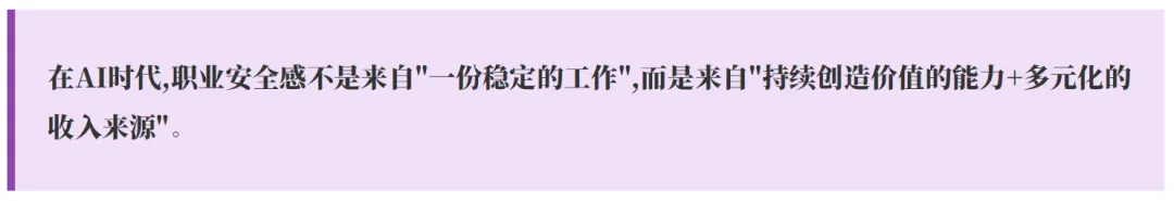 第三,职业发展路径从 “单一打工” 转向 “多元组合”。过往的职业发展,遵循着 “毕业 - 找工作 - 打工 - 升职加薪 - 退休” 的线性路径,大多数人一生只有工资这一份收入来源,职业选择少,抗风险能力弱,一旦失业就会陷入巨大的危机。而 AI 技术的普及,彻底打破了这种线性路径,“主业 + 副业” 的双轨发展模式,已经成为 AI 时代职场人的新选择。