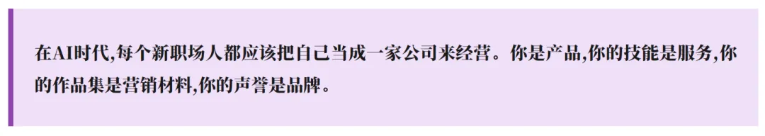 在破除误区的基础上,核心是建立 “AI + 一人公司” 的思维模式。无论你是即将求职的应届生,还是已经入职的职场新人,都应该把自己当作一家公司来经营,你是这家公司的 CEO,你的技能与作品是核心产品,你的老板与客户是核心用户,你的简历与作品集是营销材料,你的核心目标,是持续为用户创造价值,实现自身 “公司” 的持续增长。这种思维模式,能够让你从被动的打工者心态,转向主动的价值创造者心态,不再依赖企业平台赋予的职位与安全感,而是将职业安全感建立在自身持续创造价值的能力之上,这也是 AI 时代个人职业发展最核心的底层逻辑。