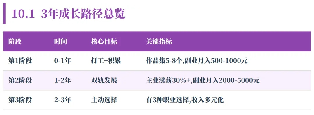 第三阶段为 2-3 年的主动选择阶段,核心目标是基于自身的成长情况,自主选择职业发展路径,实现职业发展的主动权。此时的你,拥有三个核心选择:一是选择继续打工,凭借丰富的作品集、项目经验与个人品牌,拥有极强的议价能力与职业选择权,能够选择自己真正感兴趣的工作,而不是为了薪资被迫工作;二是选择副业转正职,当副业收入已经接近甚至超过主业,拥有稳定的客户与收入来源时,可以选择全职经营自己的 “一人公司”,实现时间自由与收入上限的突破;三是选择进入更高层级的平台,凭借自身的项目经验、作品集与个人品牌,以更高的职位与薪资进入头部企业,实现职业层级的跃升。这一阶段的核心指标为:总收入较入职时增长 100-200%,拥有多元化的收入来源,作品集项目积累 15-20 个,具备自主选择职业路径的能力与底气。