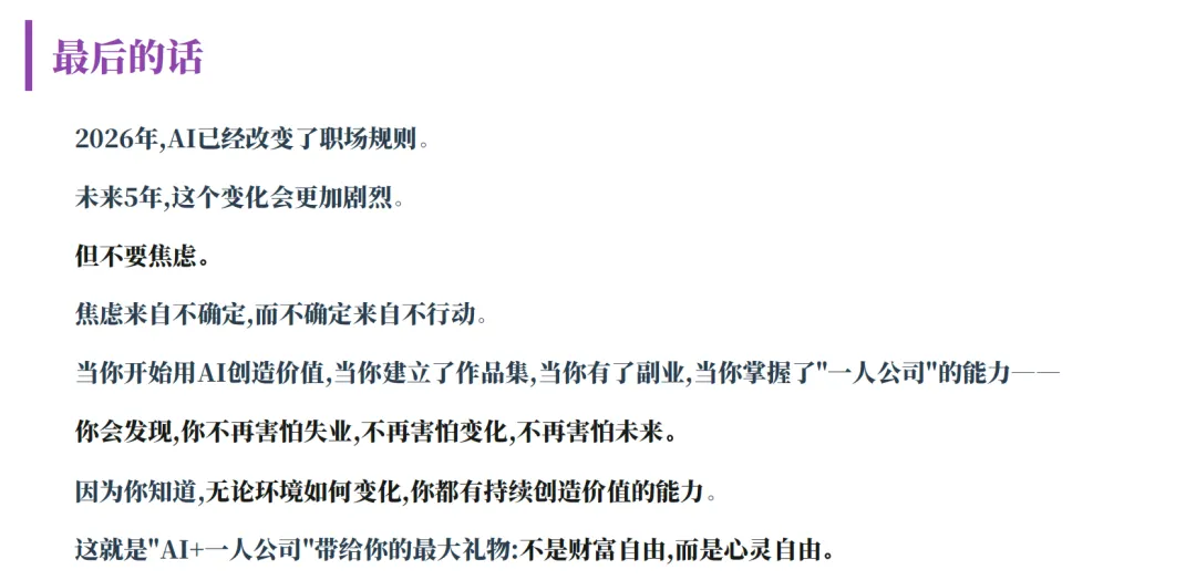 第二,AI 技术已经彻底重构了职场的底层规则,传统的线性职业发展路径被打破,“AI + 一人公司” 模式,成为 AI 时代个人职业发展的核心方向。AI 技术的普及,让人才评价体系从 “技能罗列” 转向 “价值证明”,工作模式从 “人工苦力” 转向 “AI 协同”,职业发展从 “单一打工” 转向 “多元组合”,职场的核心竞争力,已经从 “会不会用 AI”,转向 “能不能用 AI 创造可验证的价值”。而 “一人公司” 思维,让个人不再依附于企业组织,而是将自己作为独立的价值创造单元,通过 AI 技术降低创造门槛、提升交付效率、拓展能力边界,实现职业发展的主动权与安全感,这也是新职场人在 AI 时代的核心生存法则。