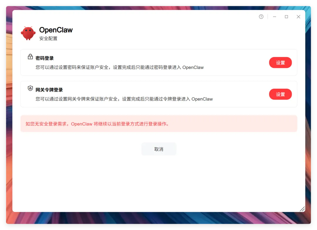 先点击右上角的设置按钮,这里可以配置 openclaw gateway webui 的 token、password 两种链接密码。