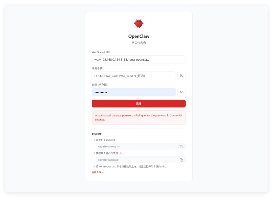 点击打开 OpenClaw 控制台,就能转跳我们熟悉的 webui 界面。在这里输入密钥或者网关令牌以登录实现对话、管理。