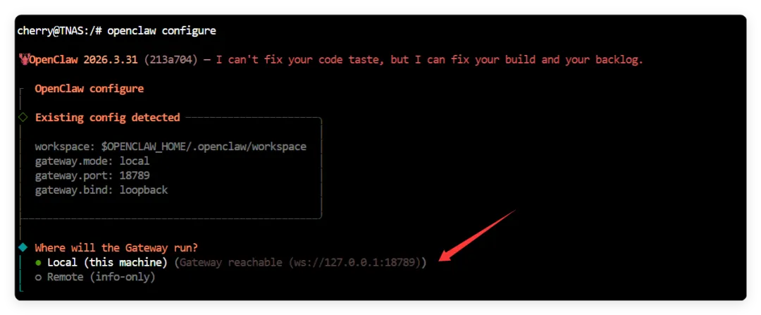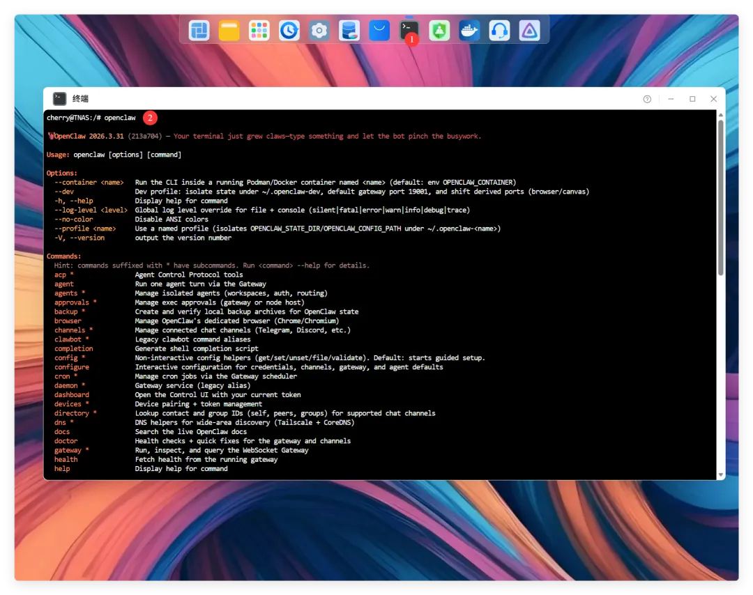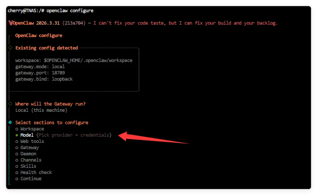 点击 配置大模型,铁威马会唤醒内置的 SSH 终端功能,我们可以通过 openclaw * 等 CLI 指令来配置接入模型、会话频道、插件等等。
