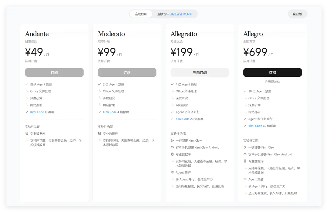 199/月的 Allegretto 套餐尚可,Kimi 2.5 自带多模态还是很不错的,新模型内测中。