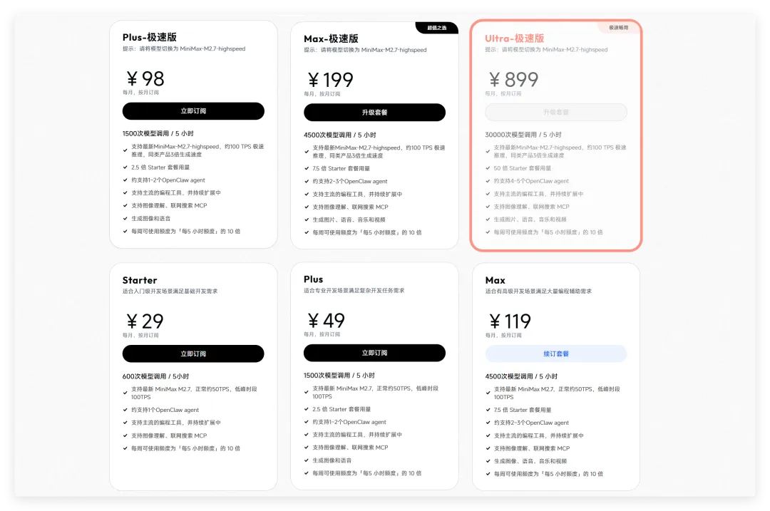 3️⃣ 稀宇 MiniMax(openclaw 直接接入) —— 推荐,新人最佳选择,量大管饱,49/月的 Plus 套餐带生图模型。