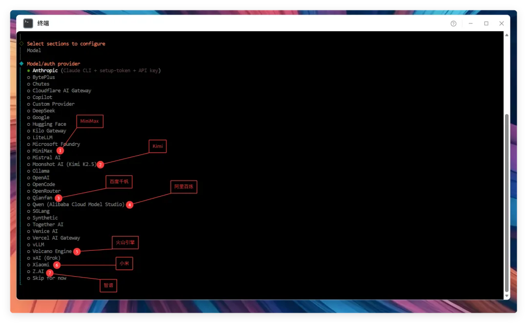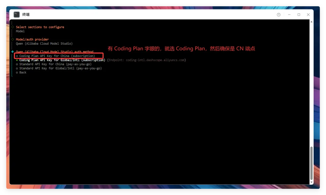 如果下一级配置项里有明显区分的,比如阿里百炼有 Coding Plan 端点、API 端口,还有国内国外区分,一律选择 国内 Coding Plan 端点。