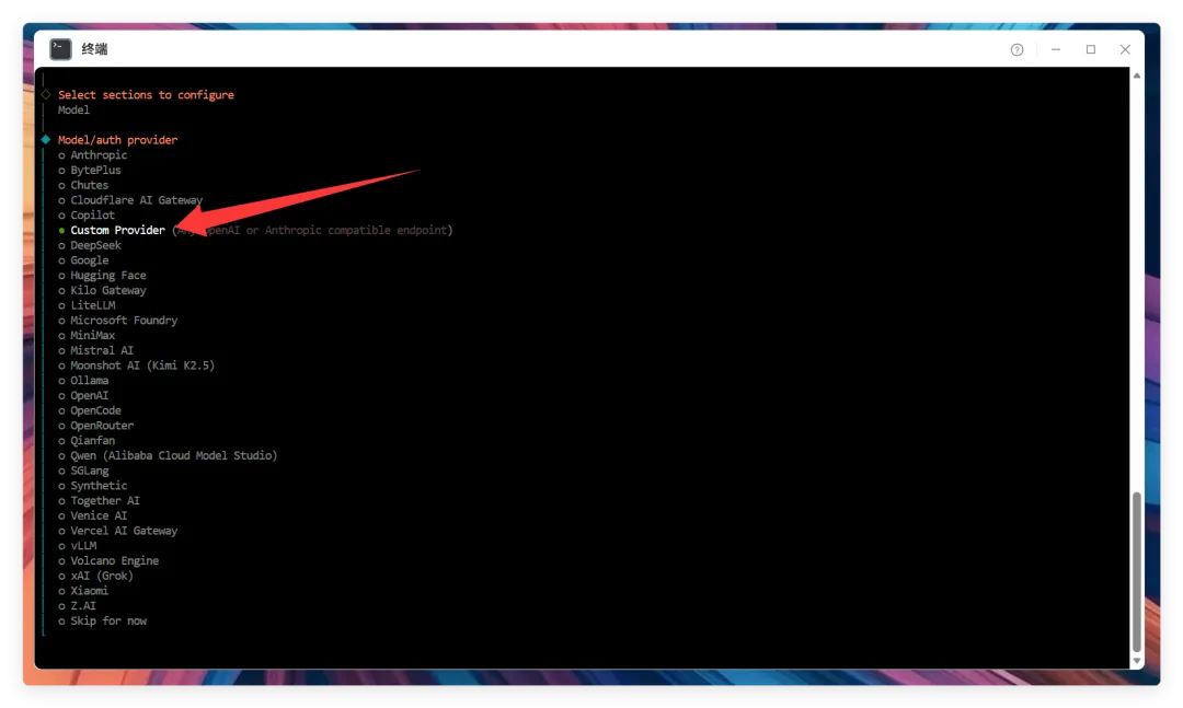 如果选择了非内置的模型厂家,那么就选择第六条的 Custom Provider 提供自定义模型。