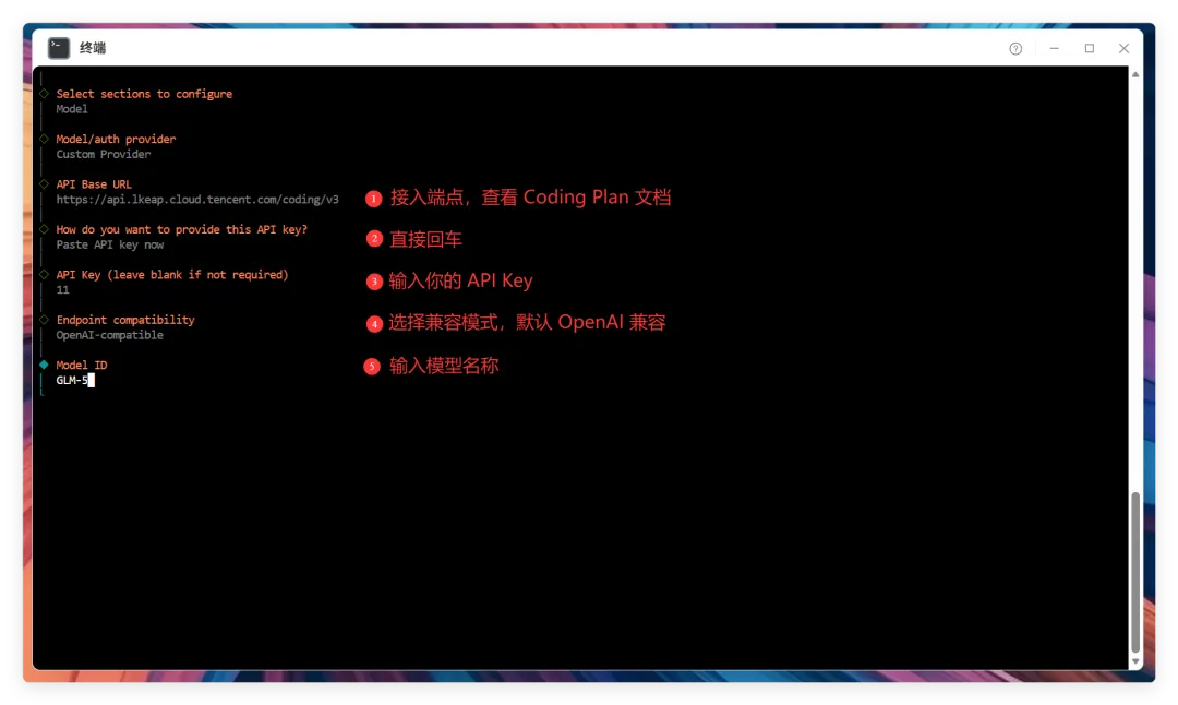依次要填入 API 端点(可查看平台文档,或者直接问 AI),Key 保存方式,API Key,兼容模式,模型名称。