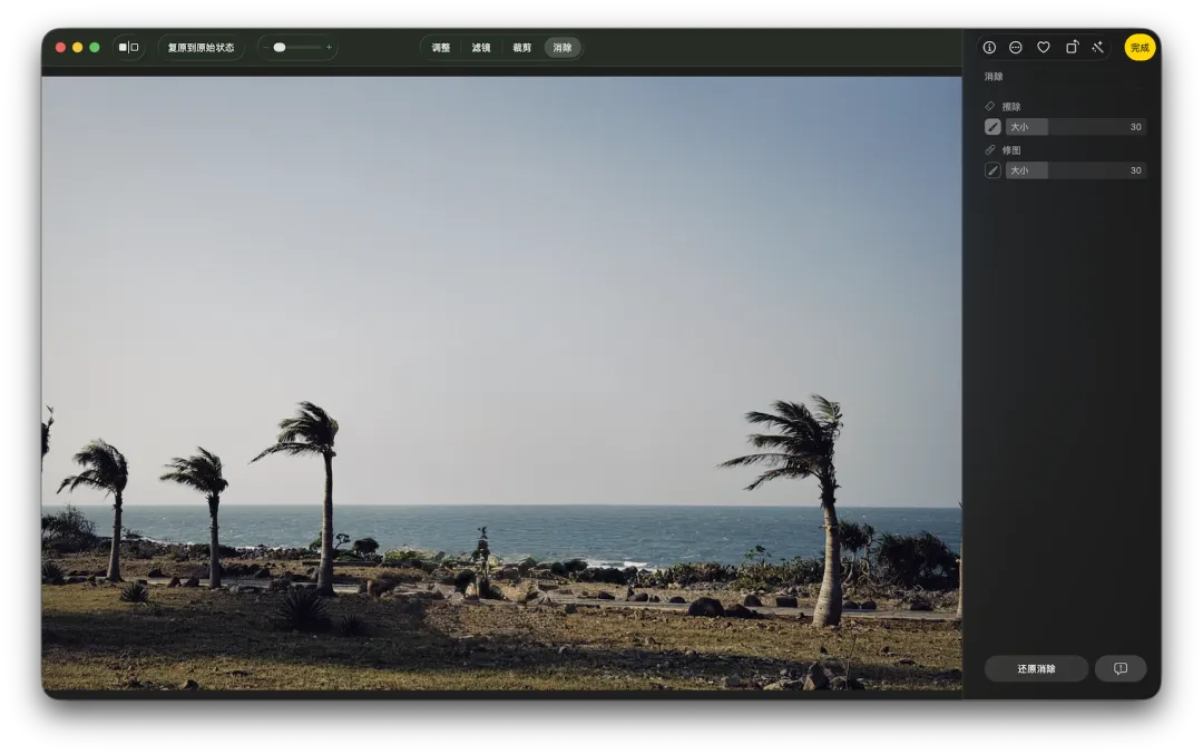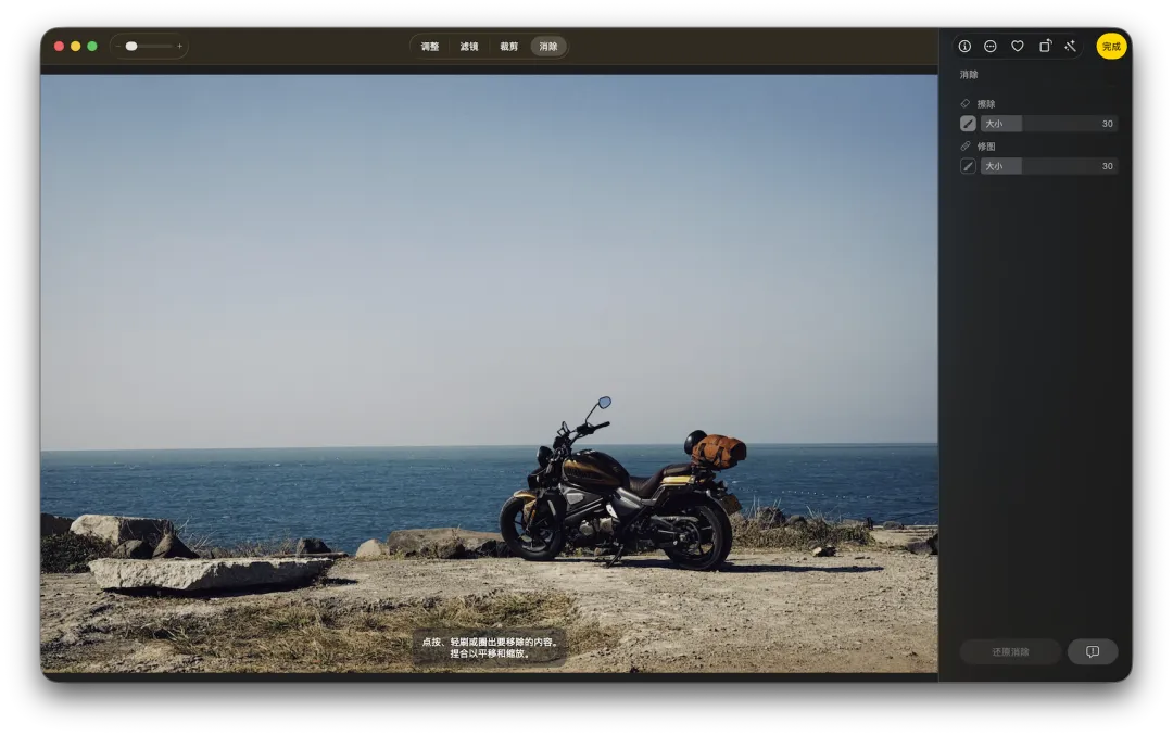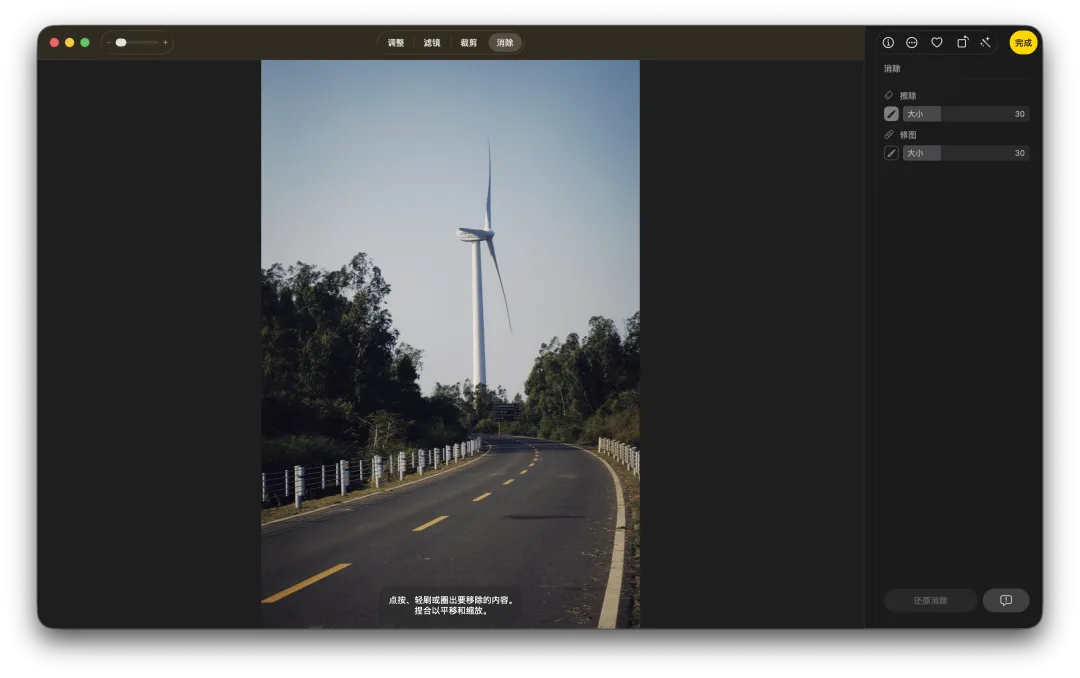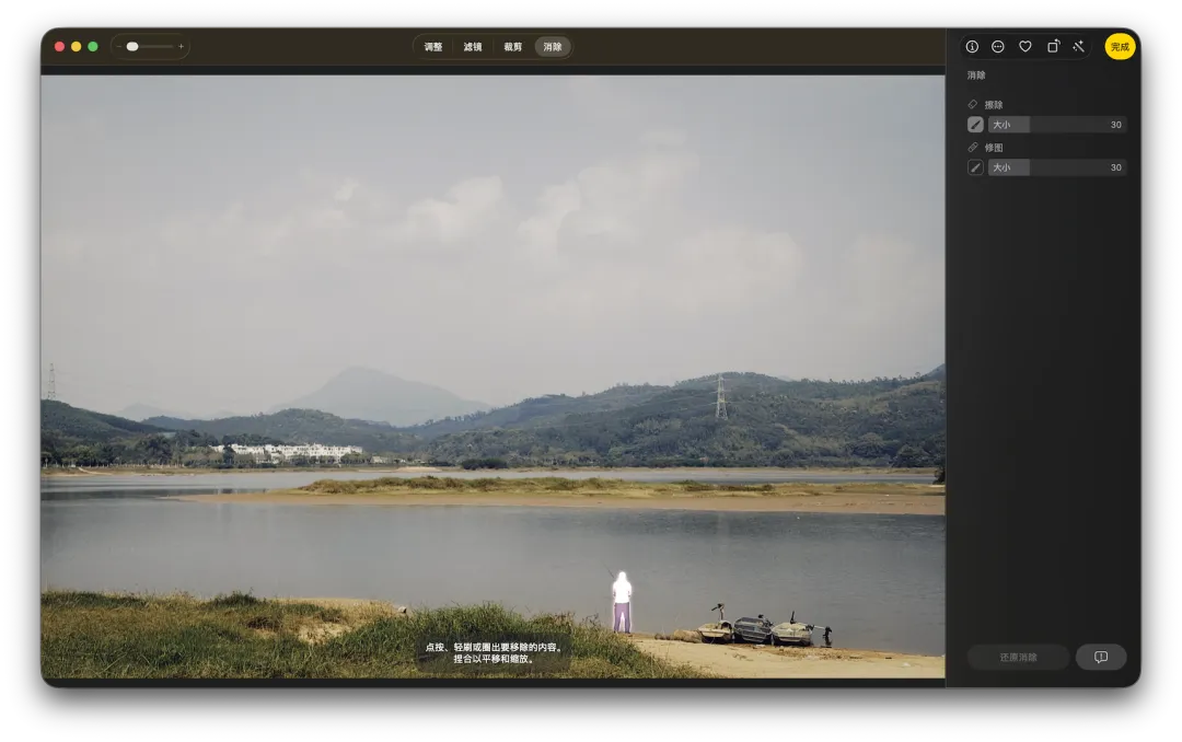 用法上 Mac 的 AI 消除和国产手机的 AI 修图也差不多:进入到 AI 消除模式后,苹果智能会先对画面做一个预识别,自动标示出可能需要消除的人或物。点击、圈选或涂抹需要消除的物件后,苹果智能会自动执行消除和填充的工序。