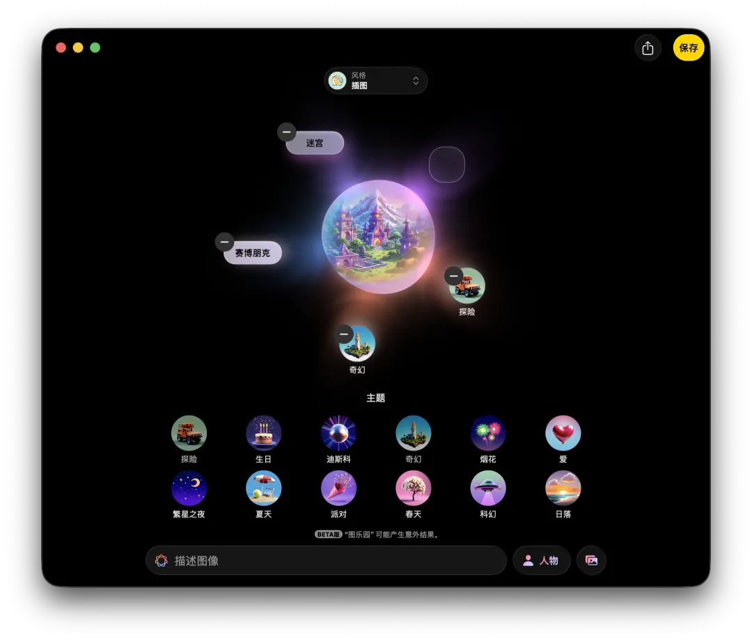 如果说这个 AI 修图还有一定的「可用性」,那苹果智能的「生图」功能就只能用「玩具」来形容了。简单来说,苹果在 macOS 中内置了一个叫「图乐园」的 App:
