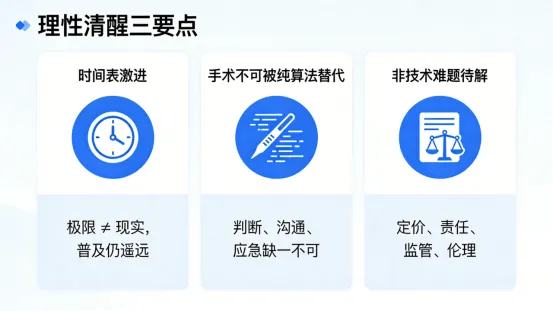AI 医疗与自主手术还面临大量非技术难题:定价机制、责任界定、监管合规、伦理规范等,这些都无法仅靠技术迭代一次性解决。