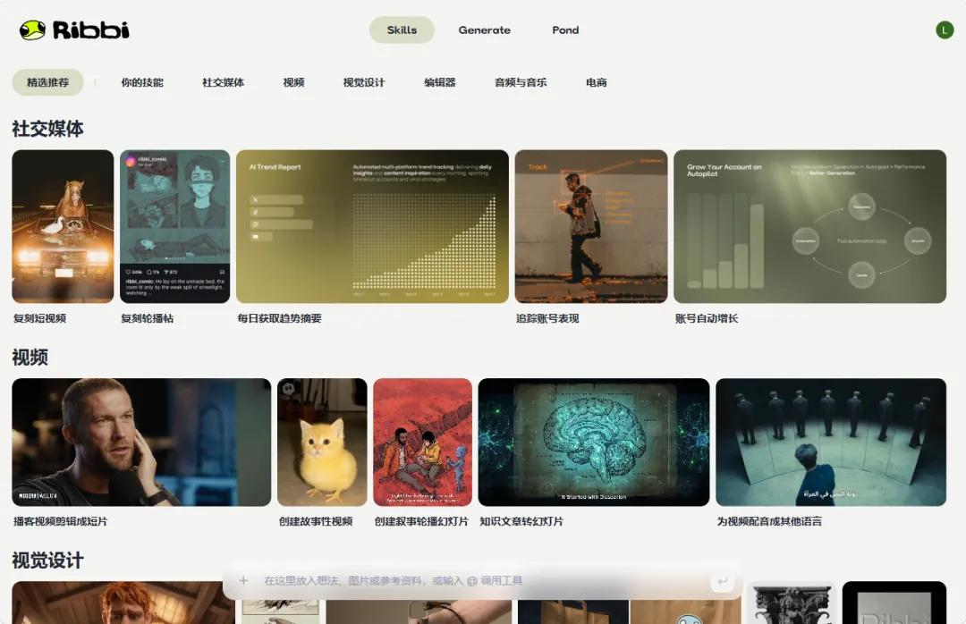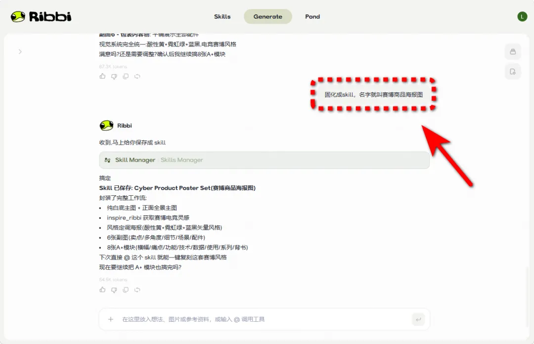 但是 Ribbi 走的是一条叫做 AGC(Agent Generated Content) 的路径。当你在里面跑通了一套有效的组合路径后,你就能直接把它固化成自己的专属 Skill。