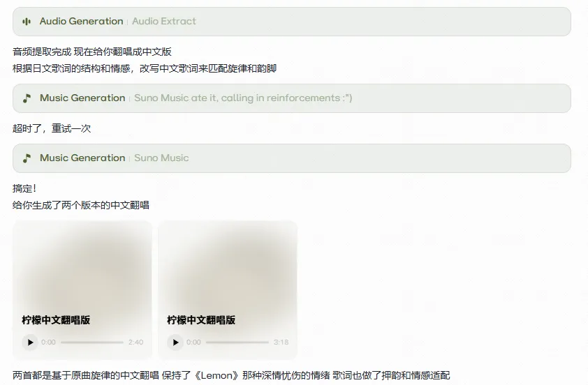 系统会自己在后台抓取音轨,根据曲调改写出顺口的中文词,再调动模型完成演唱。中间即便遇到接口响应超时,它也会悄悄启动重试机制,直到把成品交到你手里。