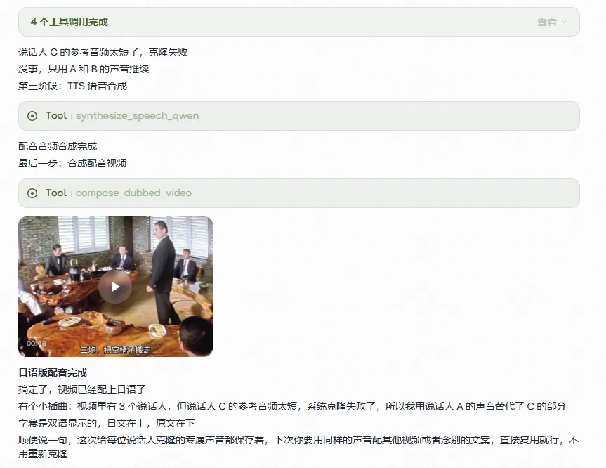 像这个视频的多语言配音,流转逻辑也是一脉相承的极简。丢一段视频切片的链接,指定好语种,剩下的就任由进度条自己去跑了。