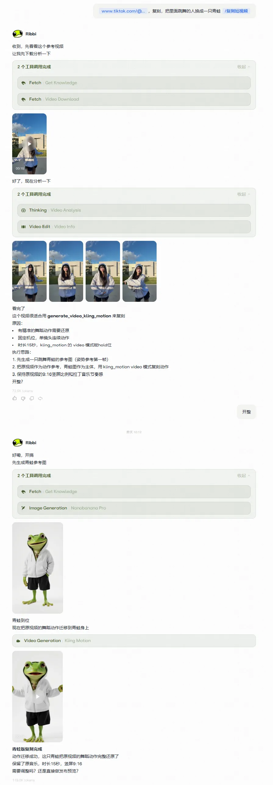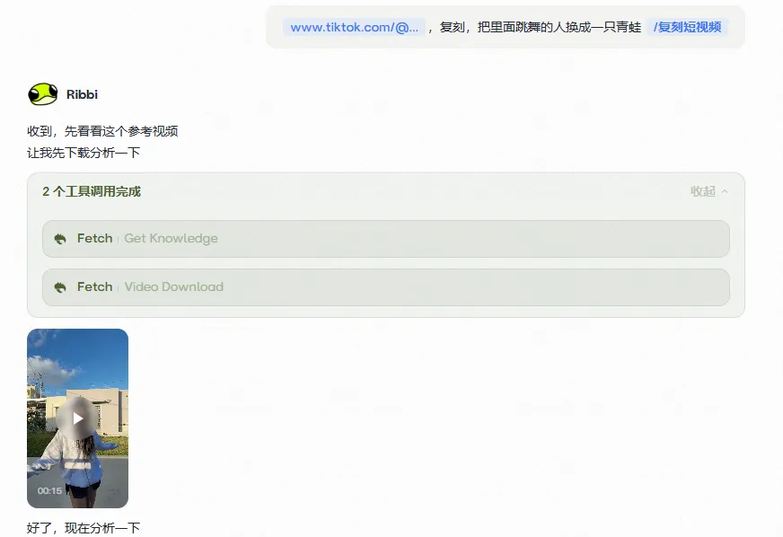 又比如我这里丢给它一个 TikTok 上的跳舞视频链接,附带要求“把人物换成青蛙”。