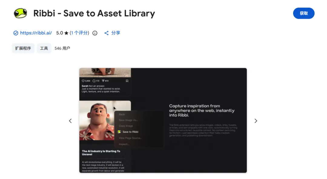 通过在浏览器上安装一个它们的插件,就能把我们平时看见的一些“对胃口”的图片保存进 Ribbi 中。