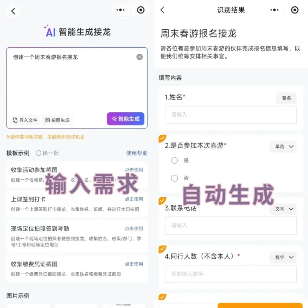 Excel 表格:打开 Excel→新建空白文档→设计表头(姓名、电话、地址……)→保存文件→发到群里→等大家下载填写。整个过程需要一定的电脑操作基础。对不熟悉 Excel 的老师或家长来说,光设计表头就可能犯难。而且,不同人用的 Excel 版本不同,格式容易错位。平均耗时:10-15 分钟。接龙管家:点击 AI 创建→输入需求(比如 “创建一个春游报名接龙,要姓名、电话、是否用餐”)→AI 10 秒内自动生成→点发布→分享到群里。不用自己设计表格,不用调格式,全程不超过 1 分钟。而且,接龙管家还有海量免费模板,活动报名、信息登记、作业收集…… 拿来就能用。结论:接龙管家更胜一筹。Excel 适合专业场景;但日常信息收集,接龙管家更简单!