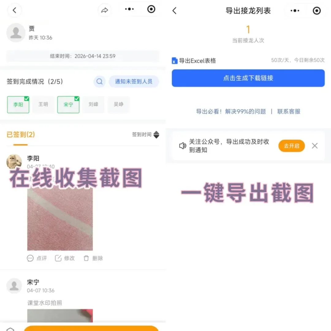 从熬夜加班到 1 分钟搞定Excel 表格:得打开几十个文件,复制粘贴到总表里。要是涉及图片,还得一张张保存、重命名、归类。整个过程又枯燥又容易出错。平均耗时:1-2 小时,甚至更久。接龙管家:收集完成后,点一下 “导出数据”:文本信息自动生成 Excel 表格,整整齐齐;图片、文件自动打包成压缩包,还能按姓名自动命名。从收集到归档,全程不超过 1 分钟。以前要花一晚上的整理工作,现在喝杯咖啡的时间就搞定了。