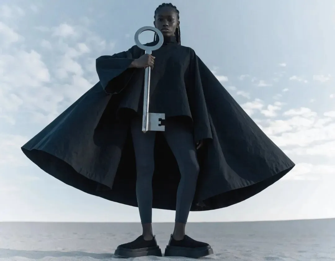 ❝A woman standing large in the frame, holding a giant key vertically in front of her like an object of focus. The key is simple and minimal in design. The environment is empty and open, with a smooth ground plane and soft sky. No additional props. Clean composition, strong silhouette, soft natural light, realistic face, surreal editorial photography.